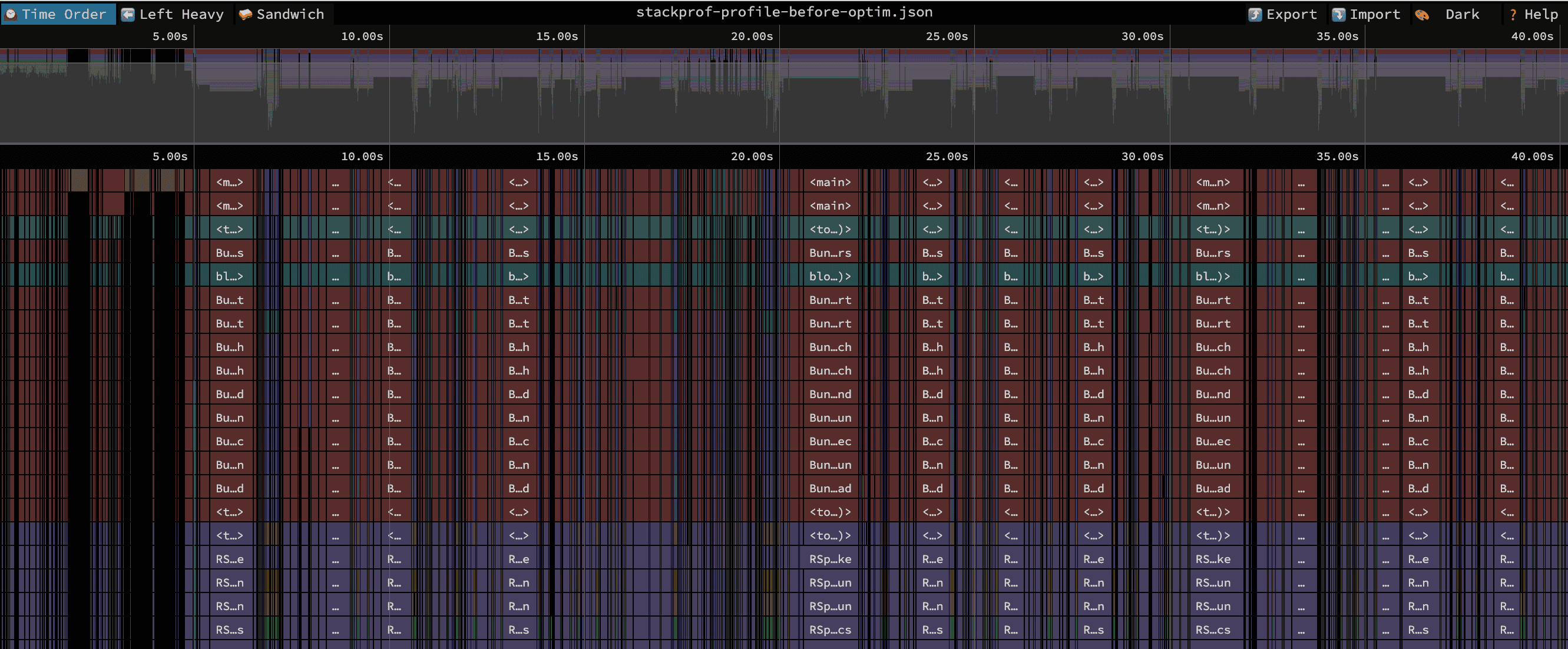 After collecting one or more profiles, you can then load them up into a flamegraph visualizer. There are many of these available, but a personal favorite of mine is Speedscope. It's a browser app that takes in JSON files, so we'll need to convert our files first: