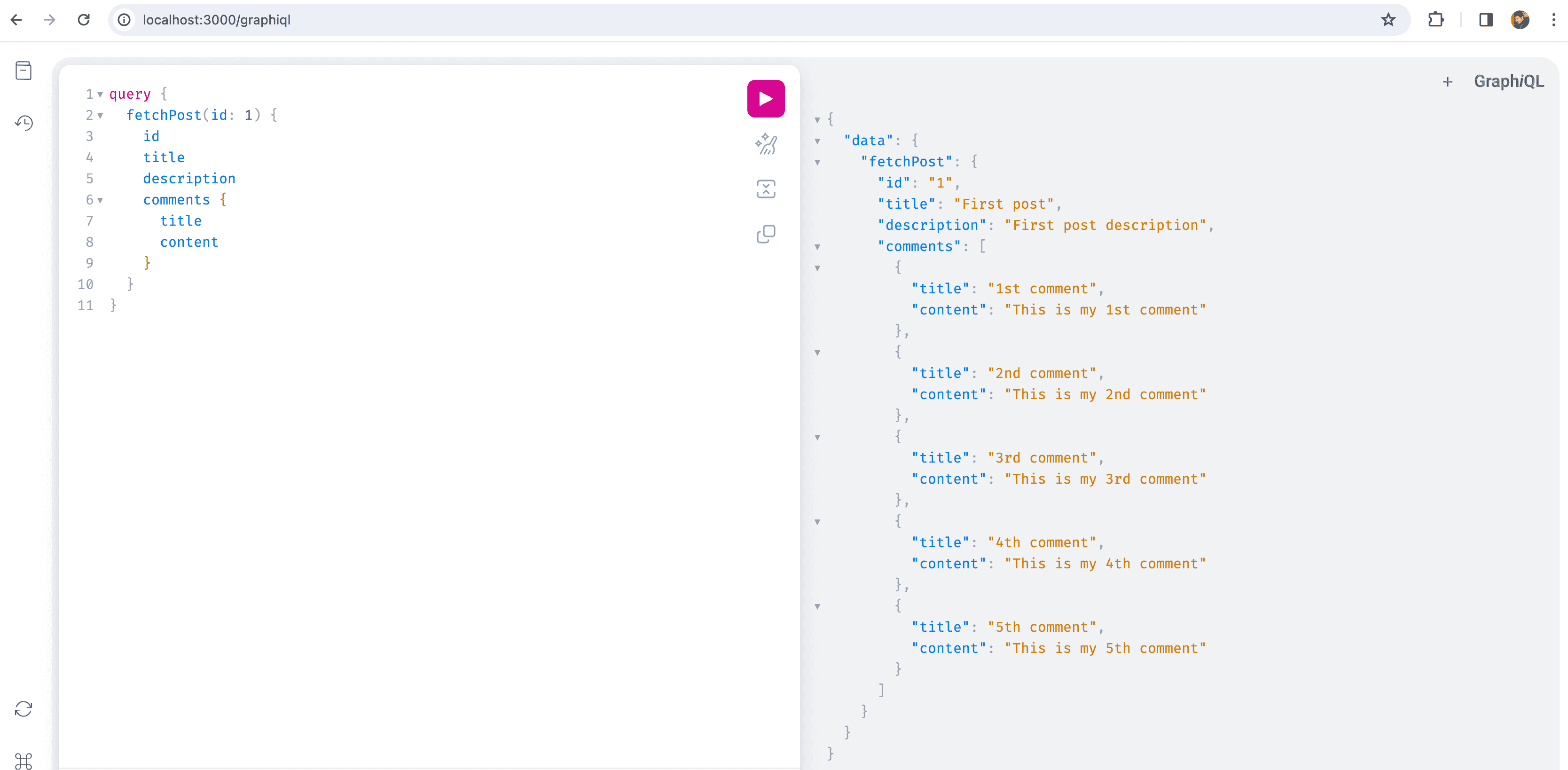 createPost(input: { params: { title: "GraphQL blog", description: "GraphQL and Ruby on Rails" }}) {