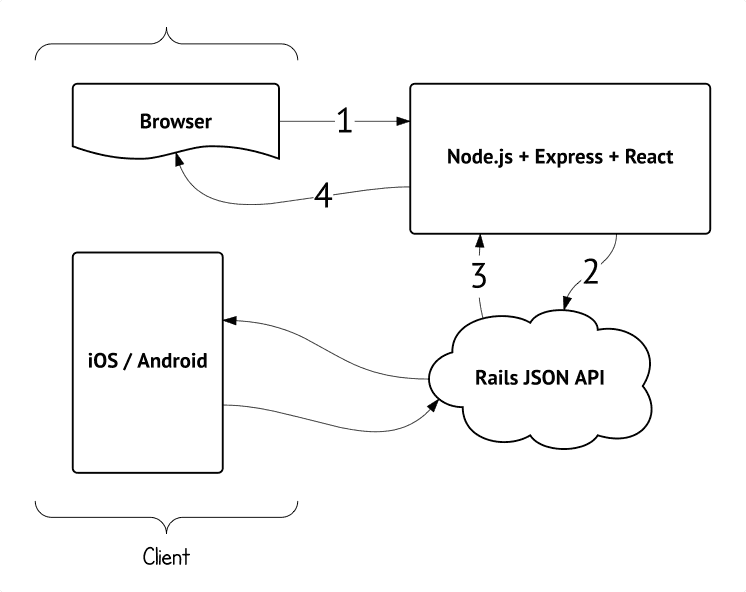 Let’s go deeper. When user hits http://my-app.com, request goes to the Node.js server with Express on top. We need the data to render initial html and send the response. So we fetch it from Rails API via http-request. When the data is arrived, React renders the view and Express sends html to the user with client JS app, which takes control over the flow. When the user hits some link on the site, app makes the ajax call to fetch the new data and updates the views on the client.