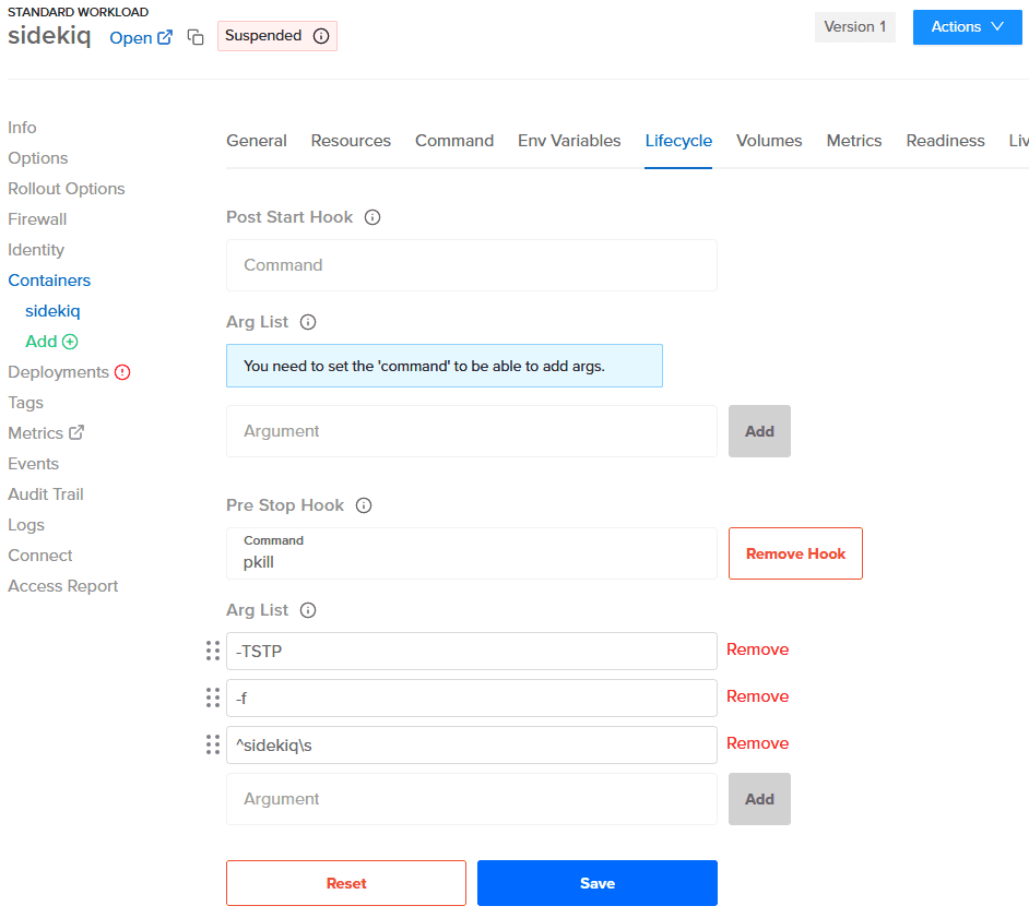 cpflow run 'rails runner "Sidekiq::ProcessSet.new.each { |w| w.quiet! unless w[%q(hostname)].start_with?(%q(criticalworker.)) }"' -a my-appSetting Up a Pre Stop Hook